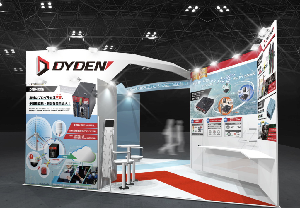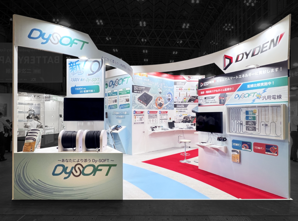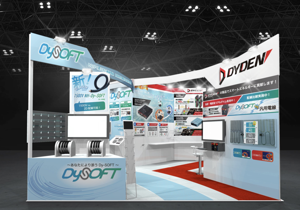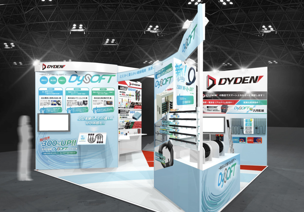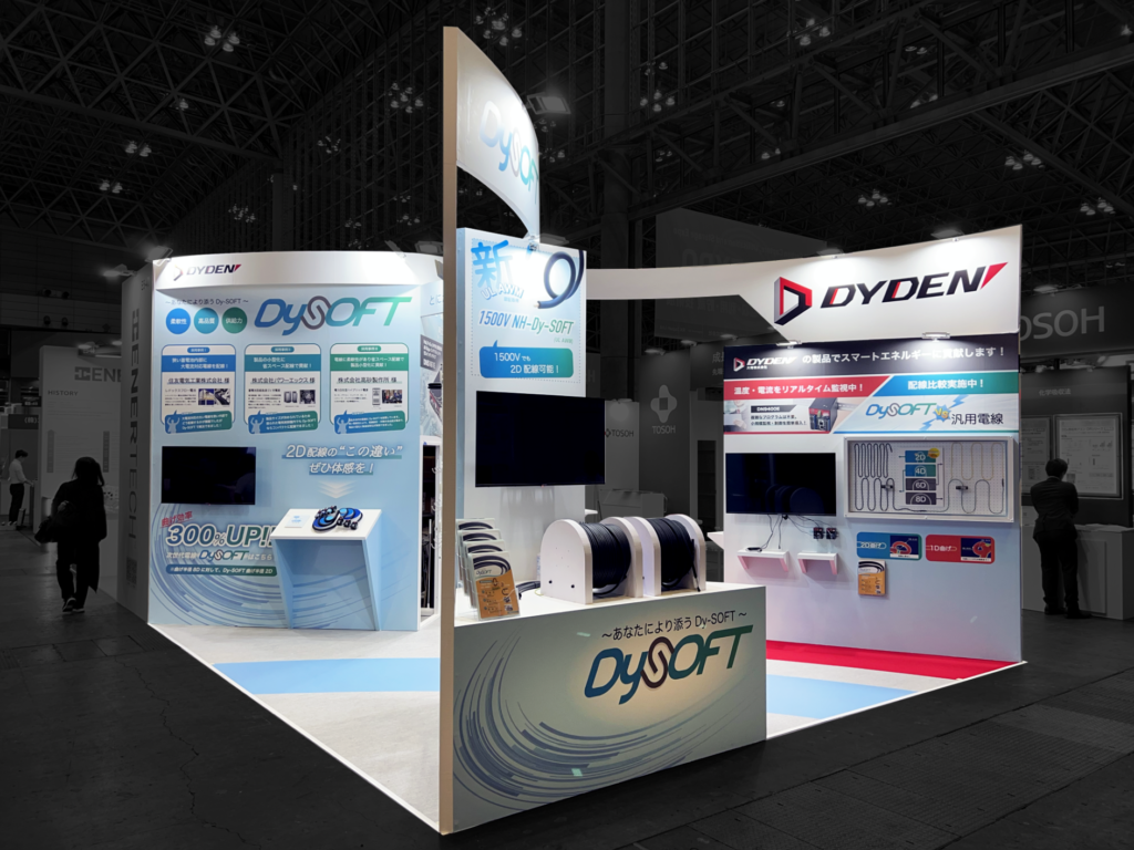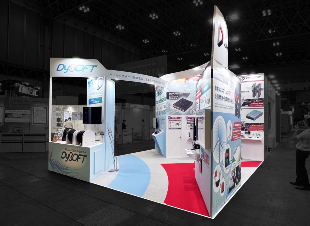 2事業部様の合同出展ということもあり、それぞれイメージカラーの青と赤を使用したグラフィックや床の貼り分けで、区別できるよう工夫いたしました。間口の広さや、上部造作の高さを調整し、圧迫感を感じにくいブース空間を目指しました。
