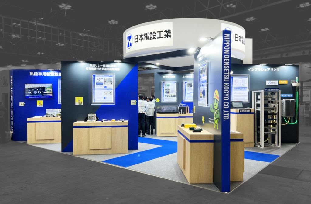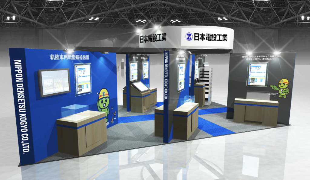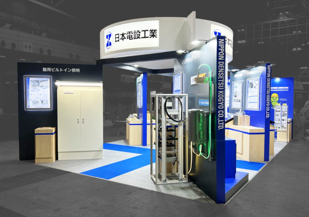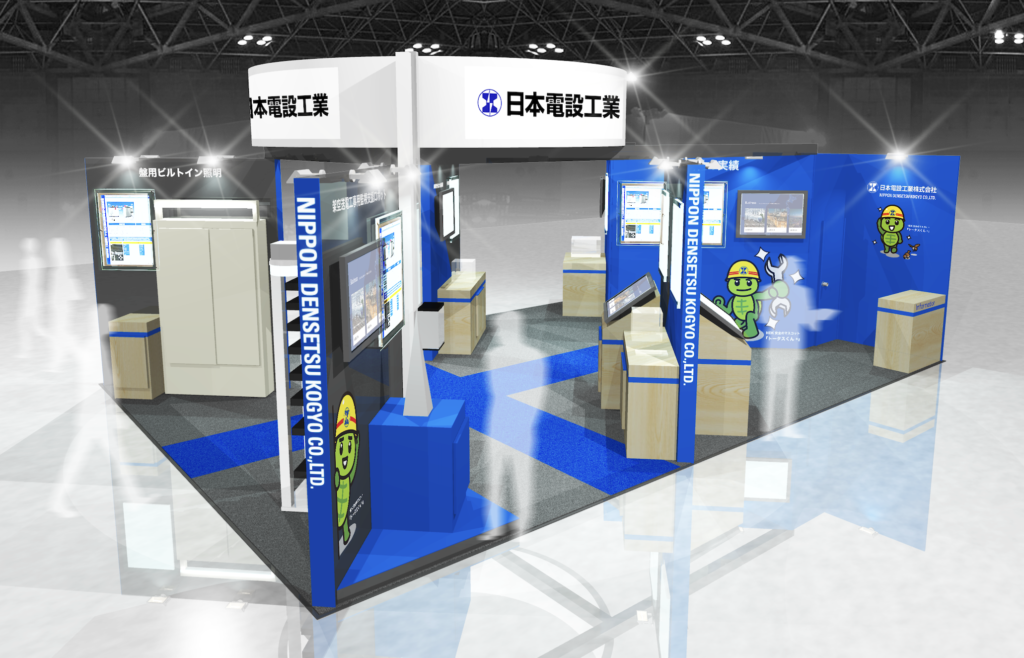 ダークグレーや木目を基調とし、これまでとは異なる雰囲気のブース装飾を目指しました。メイン通りの位置関係から、展示台や壁面の向きを調整し、より来場者様の目に留まっていただけるようにしております。通路から見えやすい位置に配置したオリジナルキャラクターは、アイキャッチとしての役割も担っております。